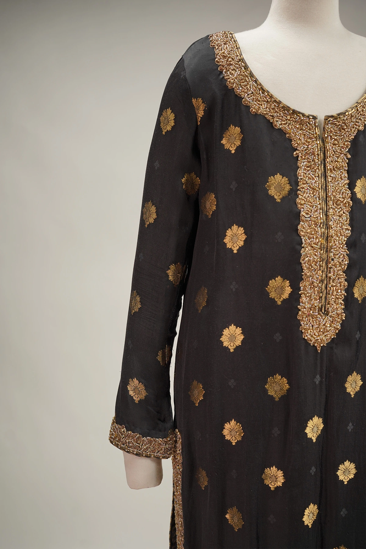 The hand embroidery is a masterclass in artisanal detail, elevating the timeless neckline and cuffs with fine craftsmanship and precision. Finished with a coordinating bottom (not shown), this ensemble is a seamless blend of tradition and luxury — perfect for soirées, intimate weddings, or festive occasions where quiet luxury makes the loudest statement.